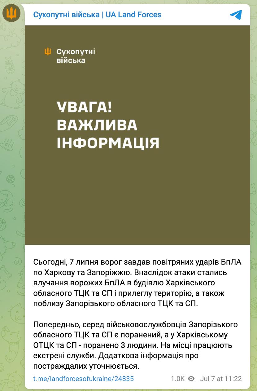 Сегодня днем Россия осуществила атаки беспилотниками на Харьков и Запорожье. В результате пострадали территориальные центры комплектации и социальной поддержки.