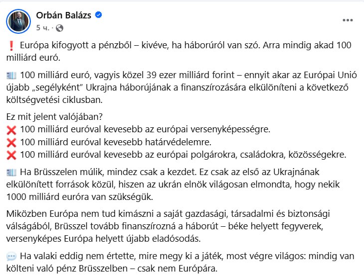 "У Европы закончились деньги, но, когда дело доходит до войны, 100 млрд евро всегда найдутся", – отметил Балаж Орбан.