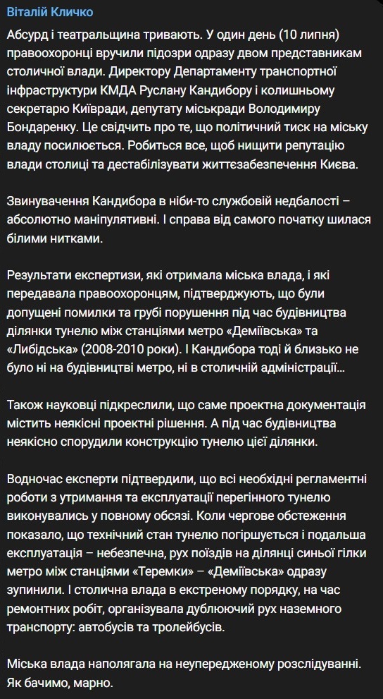 По словам Кличко, обвинения Кандибора в служебной халатности – "абсолютно манипулятивны", а в затоплении участка метро в 2023 году обвиняет ответственных за его строительство в 2008-2010-х годах.