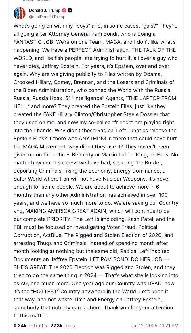 При этом сегодня ночью Трамп в своей соцсети Truth Social выступил в защиту Бонди и в целом по делу Эпштейна. Он обратился к своим "парням и девчонкам" из MAGA и призвал не делать огласку этому делу, которое, по мнению Трампа, сфабриковано "Бараком Обамой, "продажной" Хиллари Клинтон, Джеймсом Коми, Джоном Бреннаном и "неудачниками и преступниками из администрации Джо Байдена"".