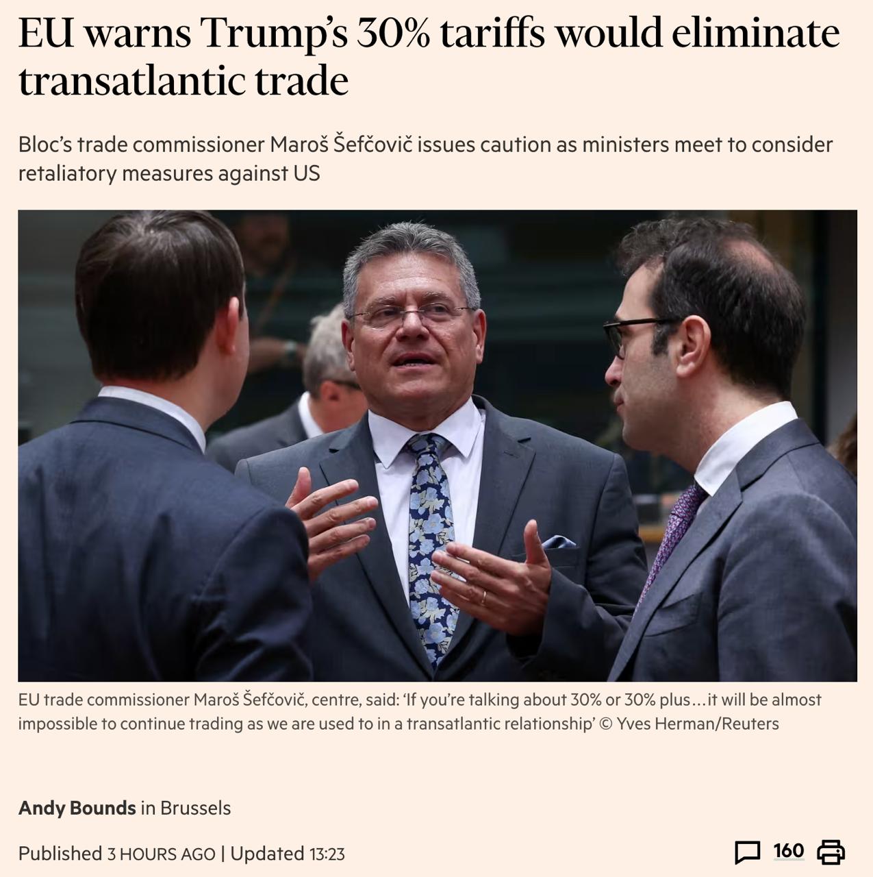 В ЕС опасаются, что торговля с США станет практически невозможной, если Трамп введет 30-процентные пошлины