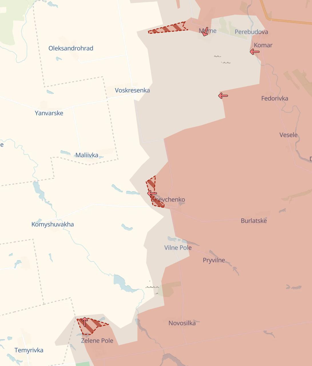Южнее, у границ Днепропетровской области, россияне захватили село Шевченко, продвинулись от Мирного в сторону Александрограда и у Зеленого поля.
