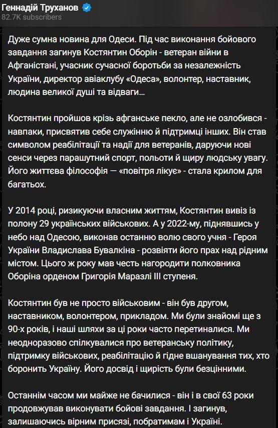 В 2014 году, рискуя собственной жизнью, Константин вывез из плена 29 украинских военных. А в 2022-м, поднявшись в небо над Одессой, выполнил последнюю волю своего ученика – Героя Украины Владислава Бувалкина – развеять его прах над родным городом. В этом году имел честь наградить полковника Оборина орденом Григория Маразли ІІІ степени", - написал Труханов.