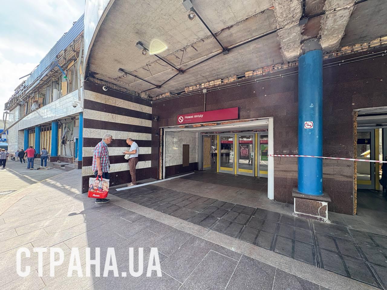 Поврежден вход на станцию метро "Лукьяновская". На видео есть задымление внутри самой станции, где укрываются люди.