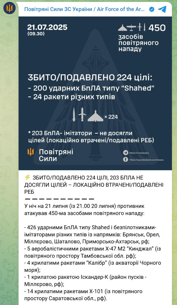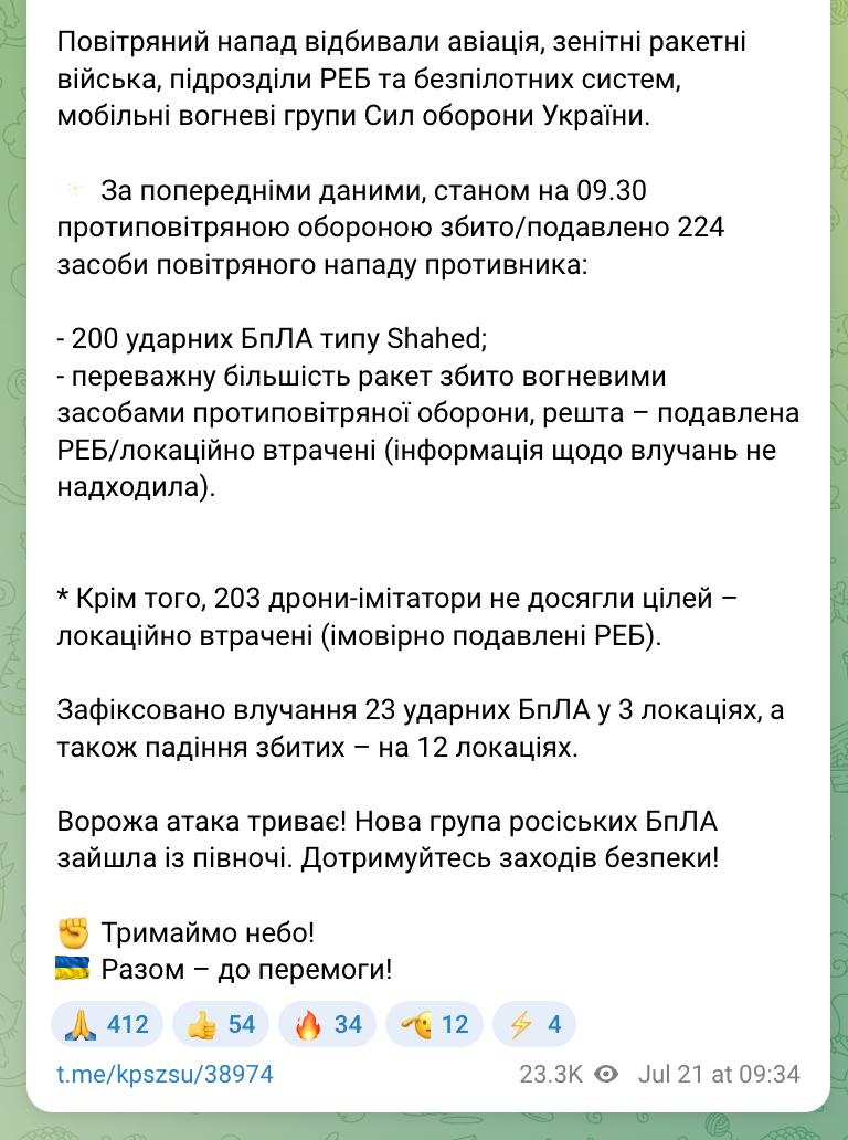 Выпущено было 426 ударных БПЛА и беспилотников-имитаторов, сбить удалось 200, еще 203 "не достигли целей – локационно потеряны".