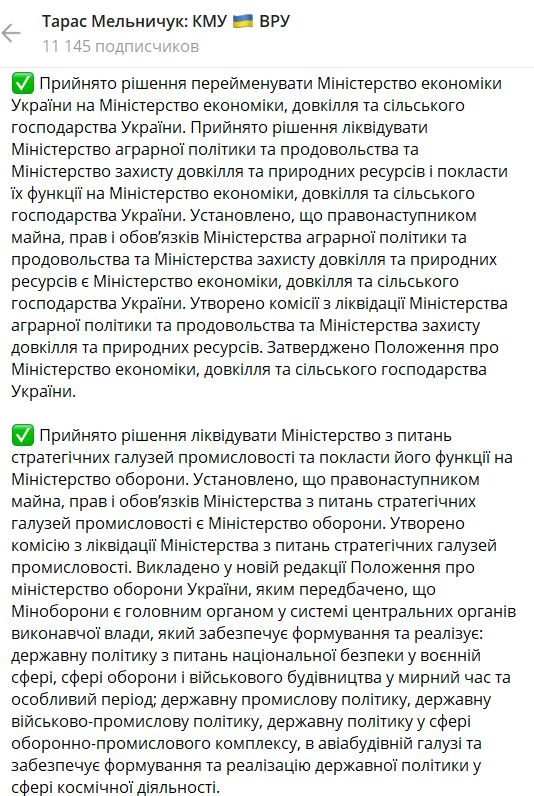 Также во время сегодняшнего заседания были ликвидированы Министерство по вопросам стратегических отраслей промышленности, Министерство аграрной политики и продовольствия и Министерство защиты окружающей среды и природных ресурсов.
