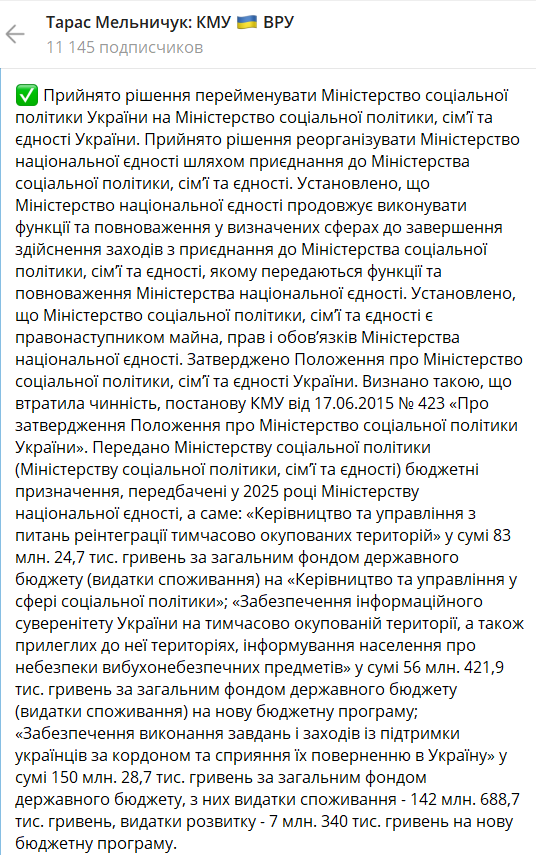 Минединства присоединили к Минсоцполитики, сообщает Мельничук. Теперь его полное название - Министерство социальной политики, семьи и единства Украины.