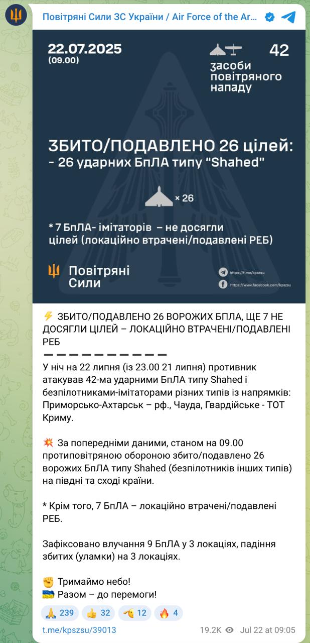 Из 42 "Шахедов" и беспилотников-имитаторов удалось сбить и подавить средствами ПВО 26, еще 7 были локационно потеряны/подавлены РЭБ.