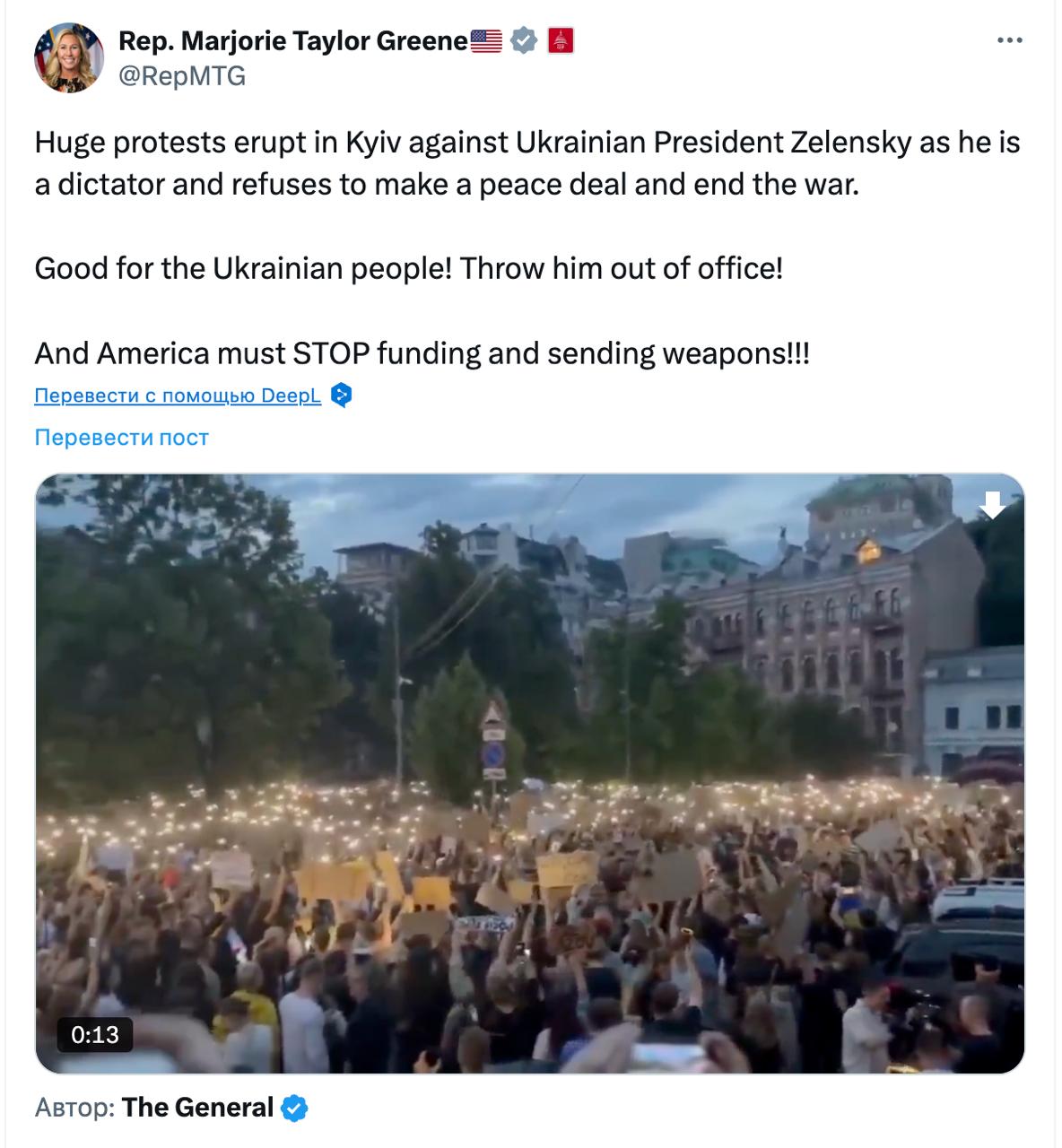 "В Киеве проходят массовые акции протеста против президента Украины Зеленского, который является диктатором и отказывается заключить мирный договор и прекратить войну. Благодарю украинский народ!" - написала Грин.