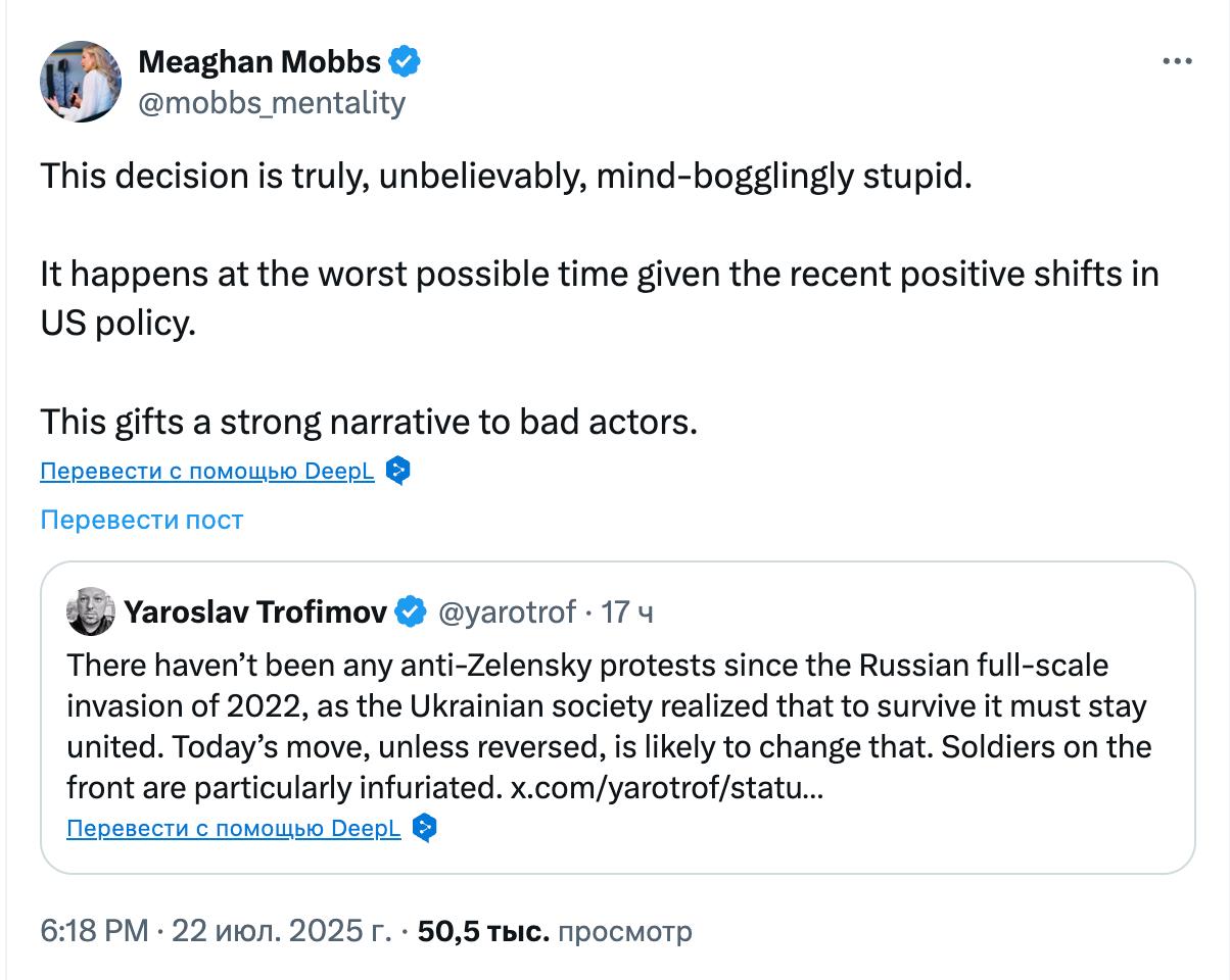 Дочь спецпредставителя США Кита Келлога Меган Моббс также раскритиковала закон о сокращении полномочий НАБУ.