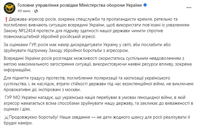 ГУР обвинило Россию в намерении использовать протесты против закона о НАБУ для ослабления обороны Украины