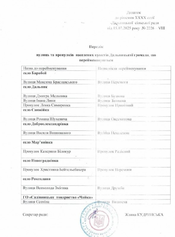 Как указано в дополнении к решению Дальницкой сельской общины, улица имени главкома УПА Романа Шухевича в селе Санжейка теперь будет называться Виноградной. А улицы, носившие имена деятелей УНР Ивана Липы и Всеволода Змиенко в селах Дальник и Роксоланы, получат имена Тихой и Дружбы.