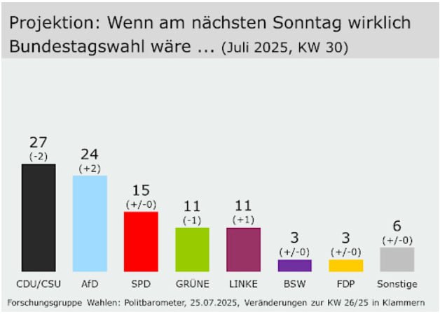 Согласно опросу, с конца июня "Альтернатива для Германии" набрала два процентных пункта и с результатом в 24% оказалась на втором месте в рейтинге политических партий Германии. Это ее лучший результат с апреля.