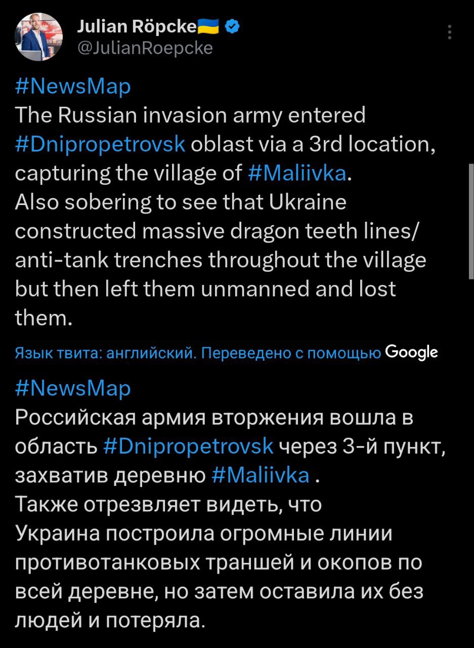 10:25 Российские войска вошли в Днепропетровскую область через третий участок и заняли село Малиевка.