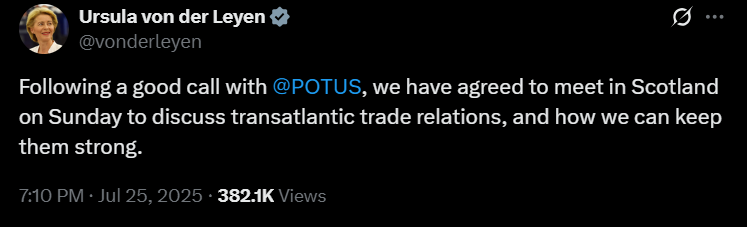 "После удачного разговора с Трампом мы договорились встретиться в Шотландии в воскресенье, чтобы обсудить трансатлантические торговые отношения и то, как мы можем сохранить их прочность", - написала фон дер Ляйен в пятницу в соцсети X.