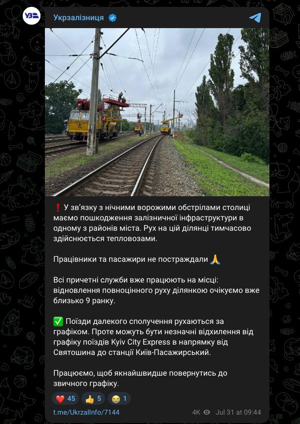 8.50 В результате ночного обстрела в Киеве повреждена железнодорожная инфраструктура в одном из районов. На этом участке временно курсируют тепловозы, сообщает "Укрзализныця".