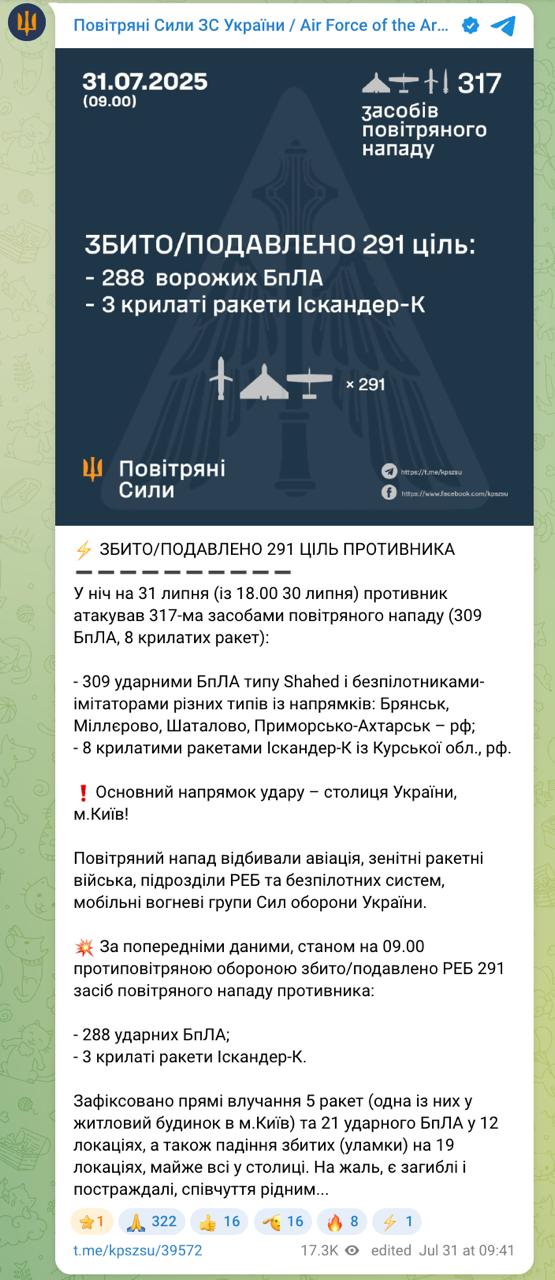Из 309 беспилотников ("Шахеды" и имитаторы) удалось сбить и подавить 288, а из 8 "Искандеров" - 3.