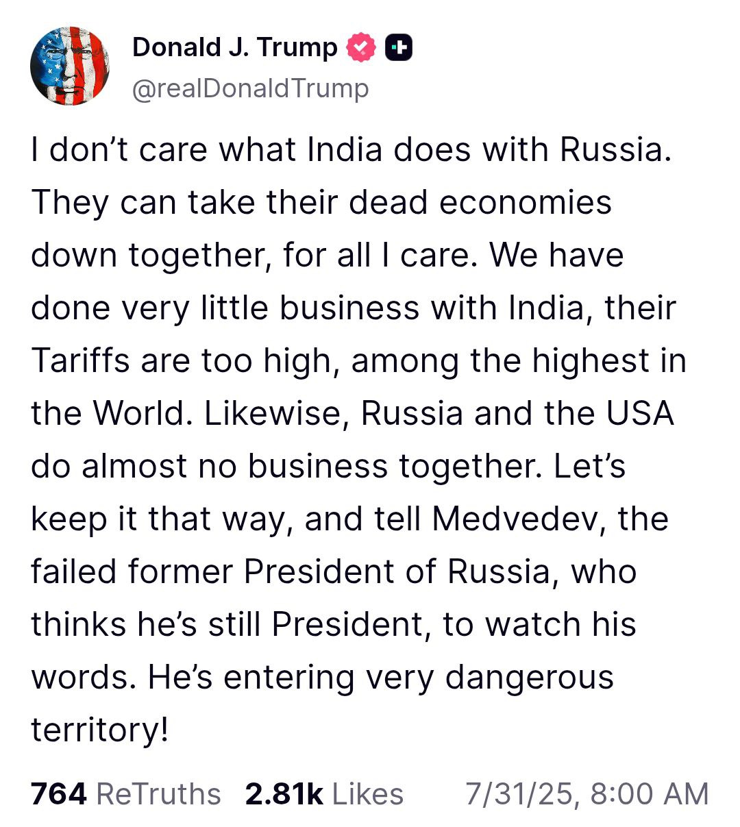 "Мне всё равно, что Индия делает с Россией. Хотят — пусть вместе тянут свои мёртвые экономики на дно. Мы и так почти не вели дел с Индией — у них слишком высокие пошлины, одни из самых высоких в мире. Точно так же Россия и США почти не ведут бизнес между собой. Давайте оставим всё как есть", - отметил глава Белого дома.