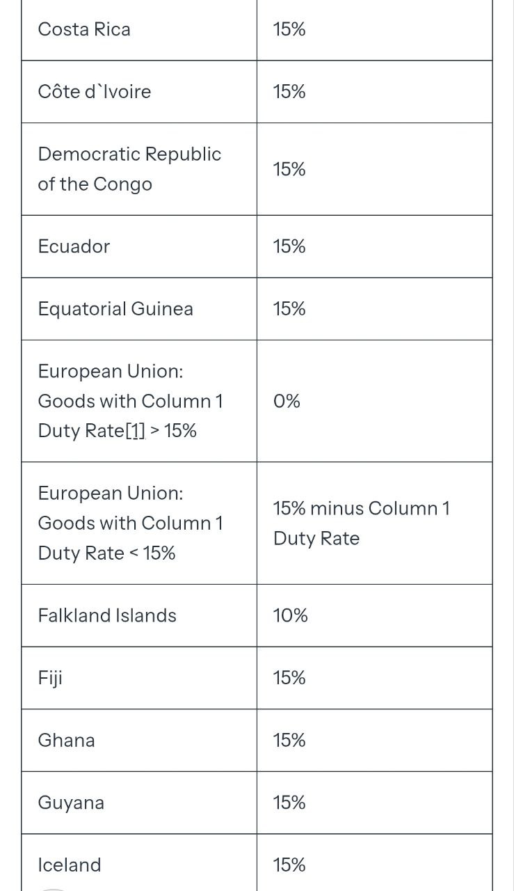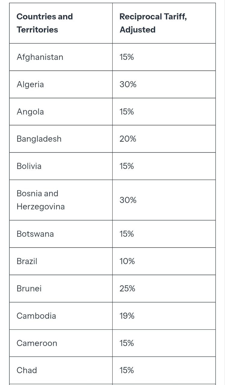 В частности, там вводятся 15-процентные тарифы для Евросоюза, 25% для Молдовы, 35% для Сербии, 39% для Швейцарии, 25% для Индии.