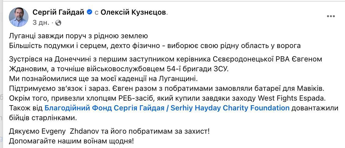 При публикации он отметил аккаунт Кузнецова, который также поделился постом Гайдая на своей странице в Facebook. Вероятно, нардеп также участвовал в снабжении бригады.
