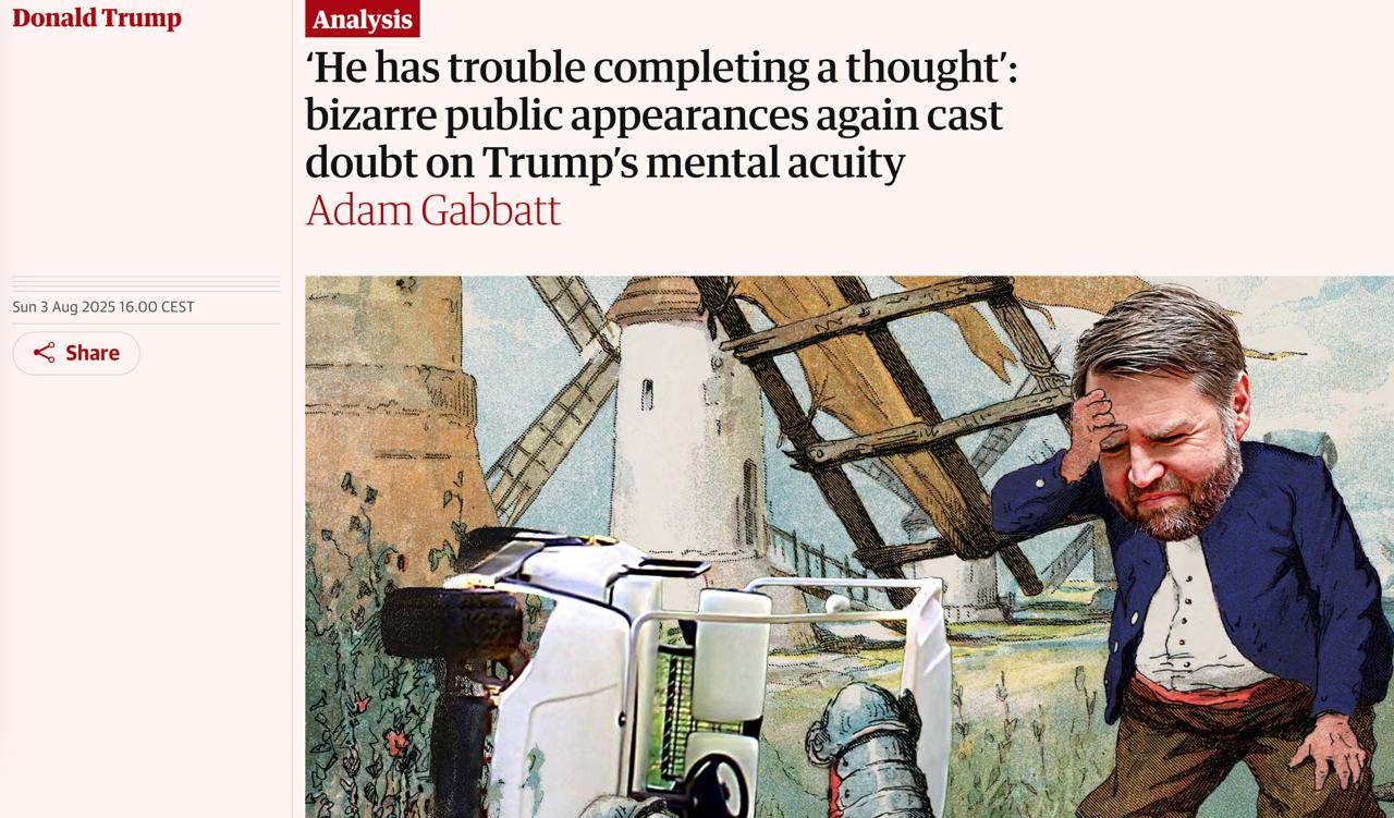 "Уже больше года 79-летний Трамп демонстрирует странное поведение на предвыборных мероприятиях, в интервью, в своих спонтанных высказываниях и на пресс-конференциях. Президент постоянно отклоняется от темы, в том числе на заседании кабинета министров в этом месяце, где он 15 минут говорил о декорировании, и, похоже, не помнит простые факты о своём правительстве и своей жизни", - пишет журналист.