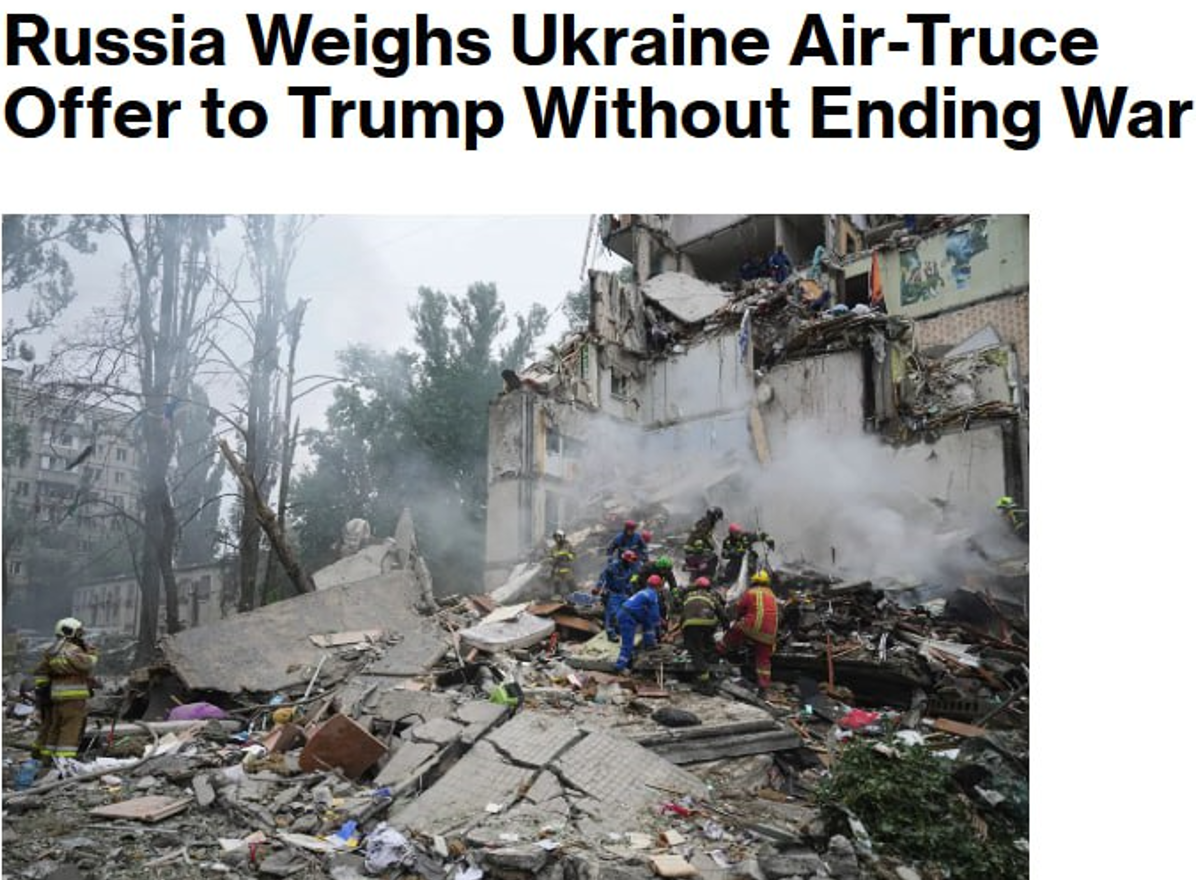 "Кремль взвешивает варианты уступок президенту США Дональду Трампу, которые могли бы включать воздушное перемирие с Украиной в попытке предотвратить угрозу вторичных санкций, даже несмотря на то что Россия по-прежнему полна решимости продолжать войну. Официальные лица в Москве признают, что визит спецпредставителя США Стива Уиткоффа в Россию на этой неделе даёт запоздалую возможность достичь соглашения с Трампом, даже если ожидания успеха невелики, сообщили источники, знакомые с ситуацией, пожелавшие остаться анонимными, поскольку обсуждались деликатные вопросы. Приостановка авиаударов с использованием беспилотников и ракет в качестве жеста деэскалации может стать одним из потенциальных предложений при условии, что Украина также подпишется под этим предложением, сказал один из них. Тем не менее президент РФ Владимир Путин не согласится на всеобщее прекращение огня в Украине, поскольку его войска продолжают уверенное продвижение на поле боя, а военные цели России остаются неизменными", – говорится в публикации.