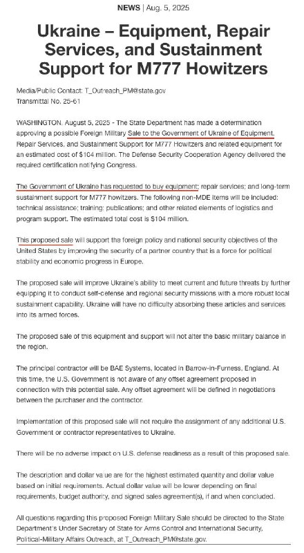 Вчера, 5 августа, Госдеп заявил, что одобрил два контракта: на $104 млн на ремонт, запчасти и обслуживание гаубиц М777; и на $99,5 млн на транспортные услуги и поддержку логистики.