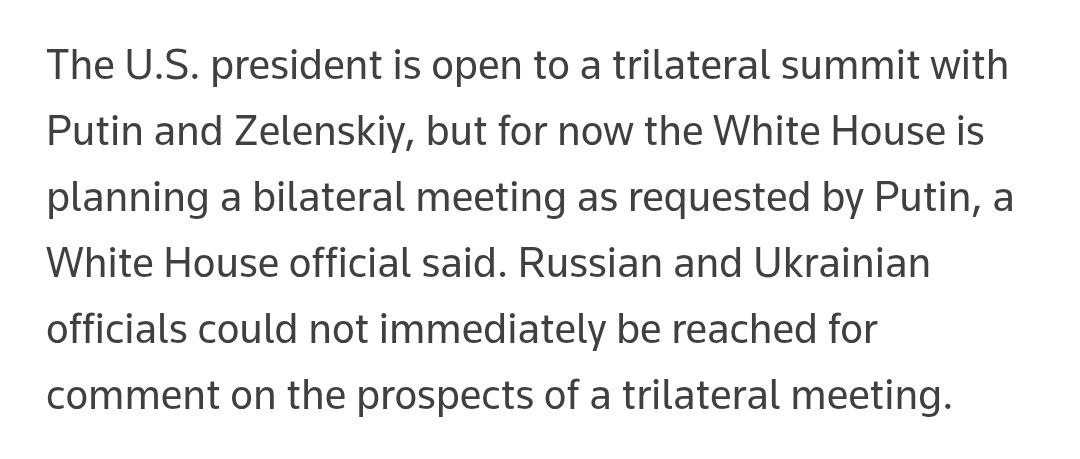 Издание пишет, что президент США "открыт для трёхстороннего саммита с Путиным и Зеленским, но пока Белый дом планирует двустороннюю встречу по просьбе Путина".