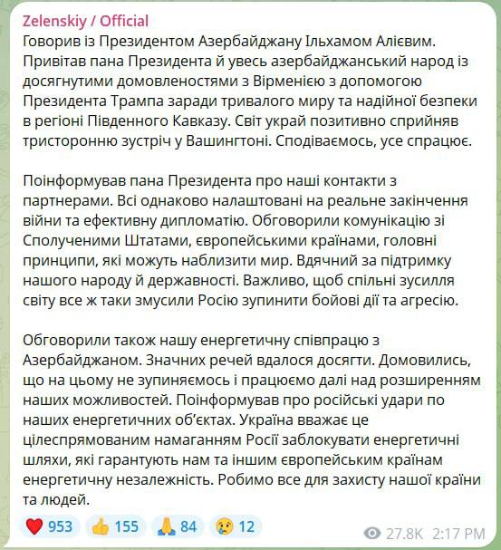 "Обсудили также наше энергетическое сотрудничество с Азербайджаном. Значительных вещей удалось добиться. Договорились, что на этом не останавливаемся и работаем дальше над расширением наших возможностей. Проинформировал о российских ударах по нашим энергетическим объектам. Украина считает это целенаправленной попыткой России заблокировать энергетические пути, которые гарантируют нам и другим европейским странам энергетическую независимость", - написал украинский президент в своем Telegram-канале.