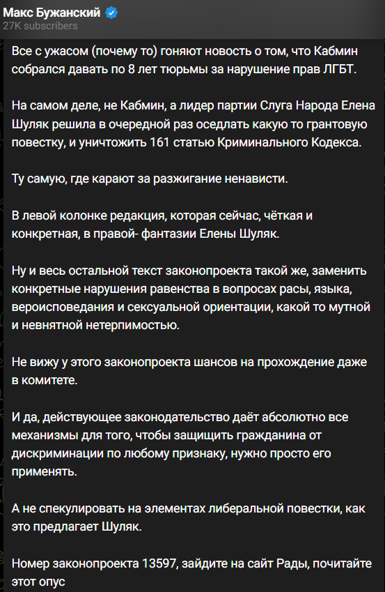 Нардеп Максим Бужанский резко критикует этот законопроект, отмечая, что "действующее законодательство даёт абсолютно все механизмы для того, чтобы защитить гражданина от дискриминации по любому признаку", и прогнозирует, что инициатива не будет одобрена даже в комитете.