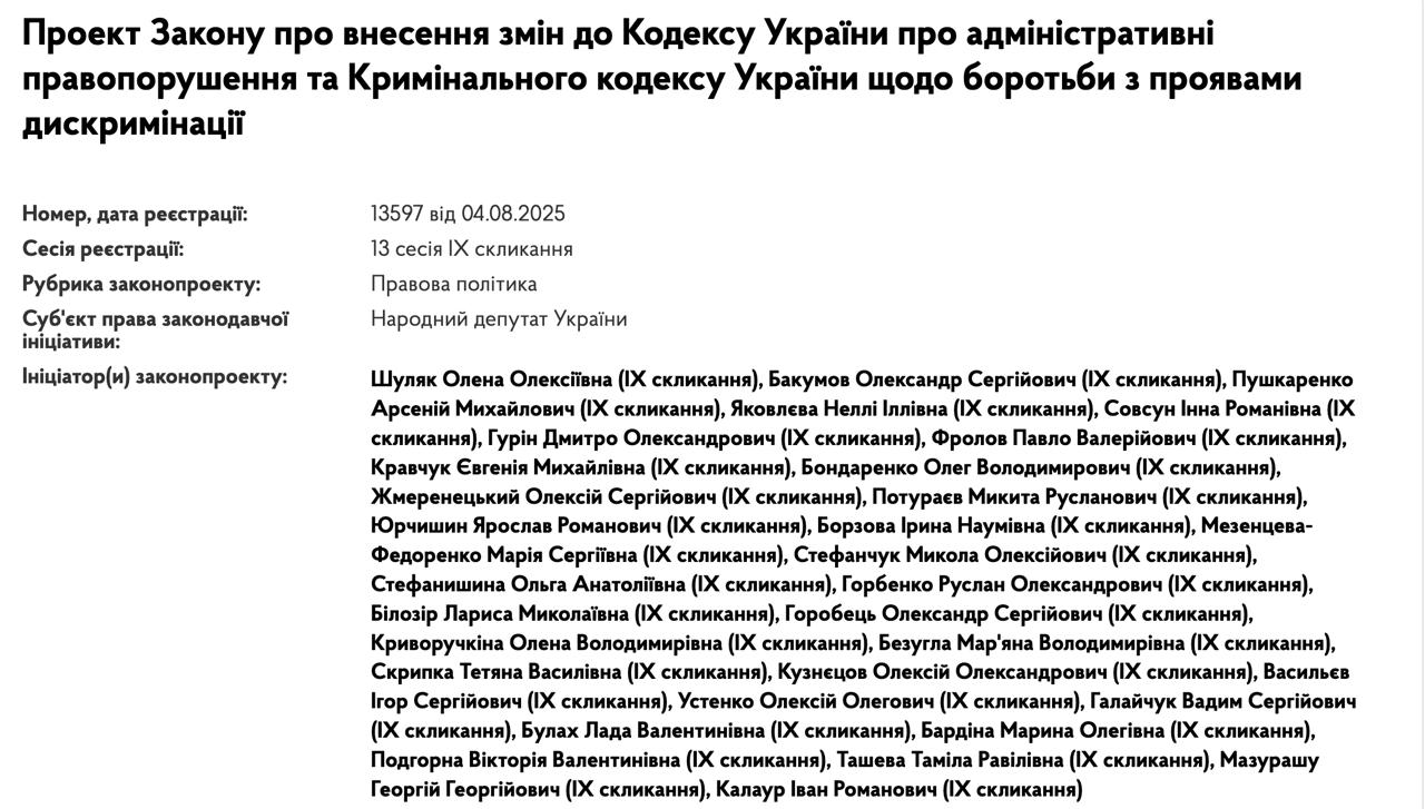 Законопроект 13597 подала группа депутатов во главе с главой партии "Слуга народа" Еленой Шуляк.