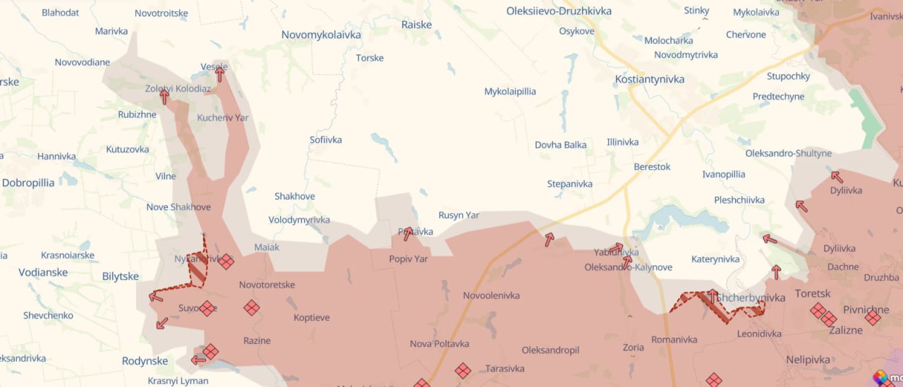 Тем временем российская армия, согласно информации паблика, продвинулась в Никаноровке (у основания прорыва фронта восточнее Доброполья), Щербиновке и возле Петровки (на Константиновском направлении).