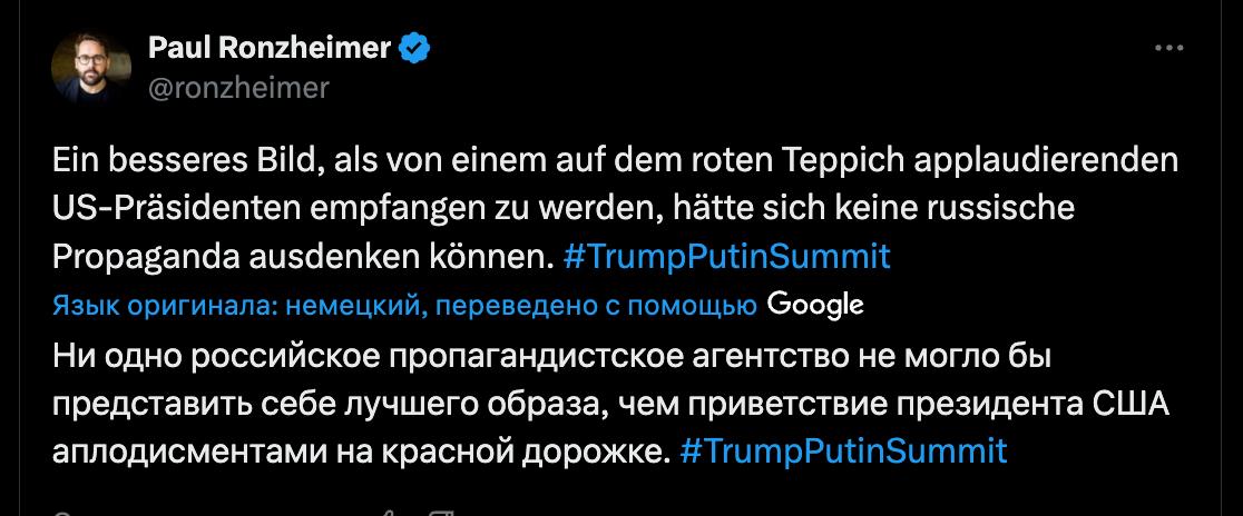 А главный редактор Bild Пауль Ронцхаймер критикует Трампа за встречу Путина аплодисментами.