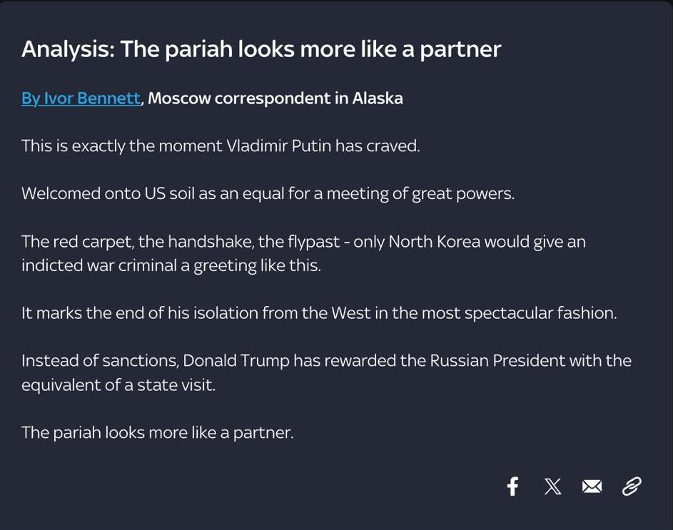 Спецкор Sky News на Аляске Айвор Беннет считает, что встреча Трампа с Путиным знаменует конец международной изоляции президента РФ, "изгой выглядит скорее как партнер".