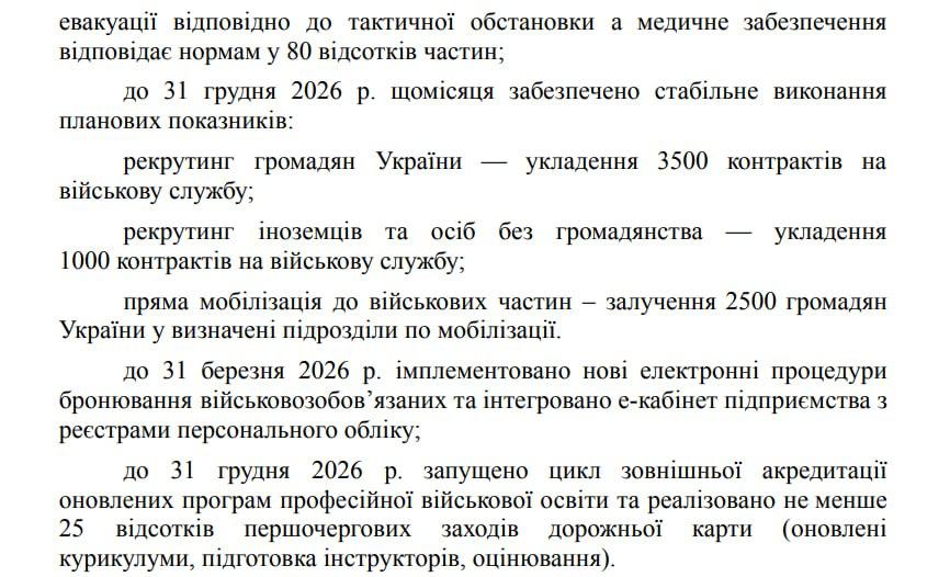 В программе правительства заложено, что до 31 декабря 2026 года ежемесячно по программе рекрутинга подписывать контракты с ВСУ будут 3500 граждан Украины и 1000 иностранцев и лиц без гражданства. При этом принудительно мобилизовать каждый месяц будут 2500 граждан Украины.