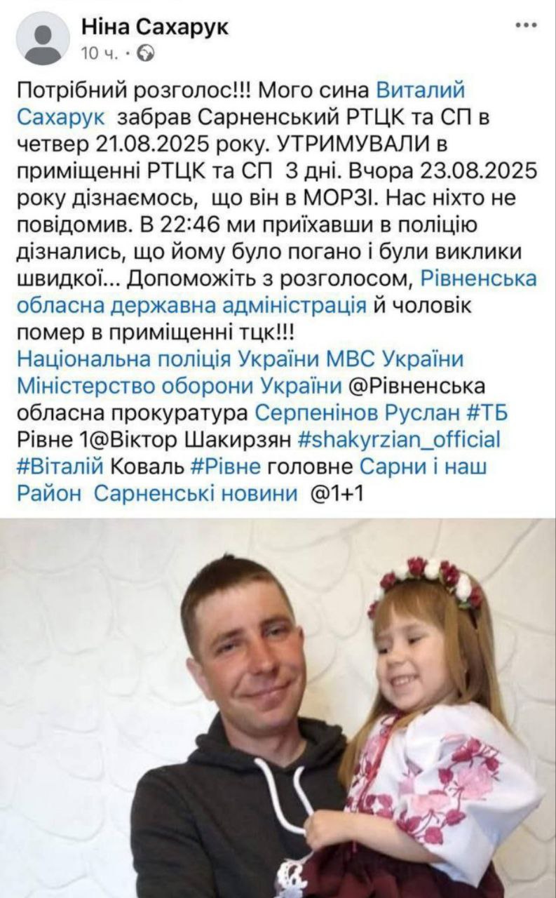 15:13 Ровенский ТЦК заявляет, что мобилизованный Виталий Сахарук погиб из-за сердечной недостаточности после успешно пройденной ВВК, и его не били.