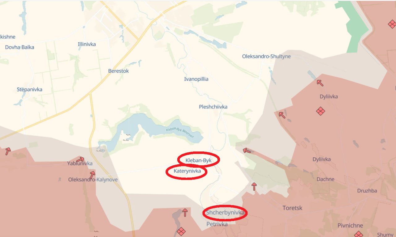 Клебан-Бык: сейчас этот населённый пункт в центре противостояния, армия РФ пытается обойти его с разных сторон, чтобы перерезать сообщение и взять село в полукольцо. Постоянные штурмы идут с применением дронов, авиации и тяжёлой артиллерии.