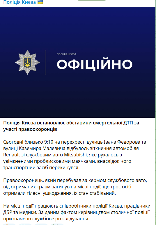 В Киеве на перекрестке столкнулись Renault и служебный Mitsubishi с включенными проблесковыми маячками. От удара служебный автомобиль перевернулся. Погиб полицейский.