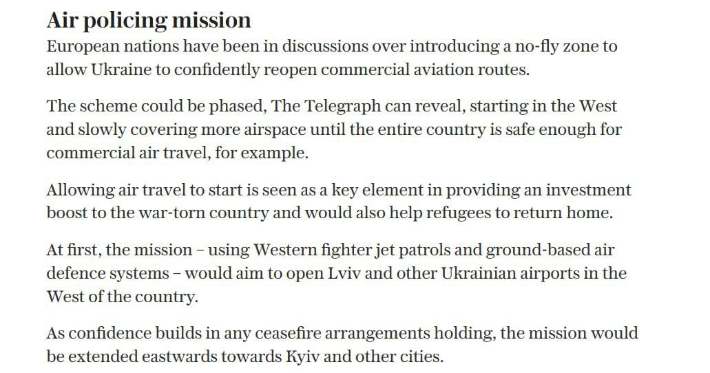 В статье The Telegraph о возможном размещении американских ЧВК в Украине говорится об обсуждении создания над Украиной бесполетной зоны после возможного перемирия.