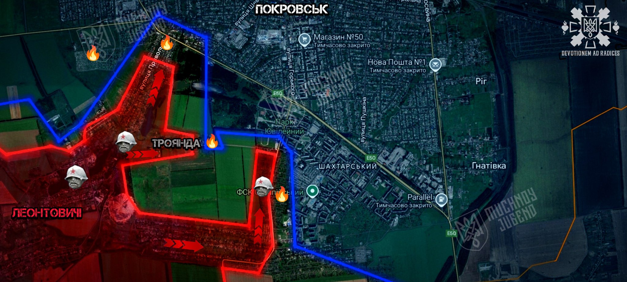 "Противник также продвинулся в районе дачных массивов, прилегающих к жилым кварталам Покровска", - пишет "Мучной". По публикуемой им карте, россияне уже ведут бои в самом Покровске, куда вошли с юго-запада.