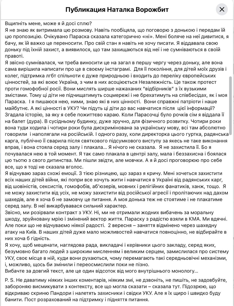 "На странице в Инстаграме Параски (которой она последний раз пользовалась в 2024 году и на которую подписаны все ее родственники), они нашли эмодзи – флажок ЛГБТ. Еще там есть флаг Украины и четыре фото – два с котом и два селфи. Следовательно, этот флажок, который для нее означает толерантность и человечность, демократичность, принятие мира в его разных красках, стал причиной отказа на проживание в коллегиуме, который не является монастырем или сектой, а относится к учебному заведению", - пишет Ворожбит.
