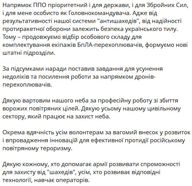 При этом он заявил о строительстве эшелонированной системы обороны от российских ударных беспилотников и формировании новых экипажей по борьбе с дронами.