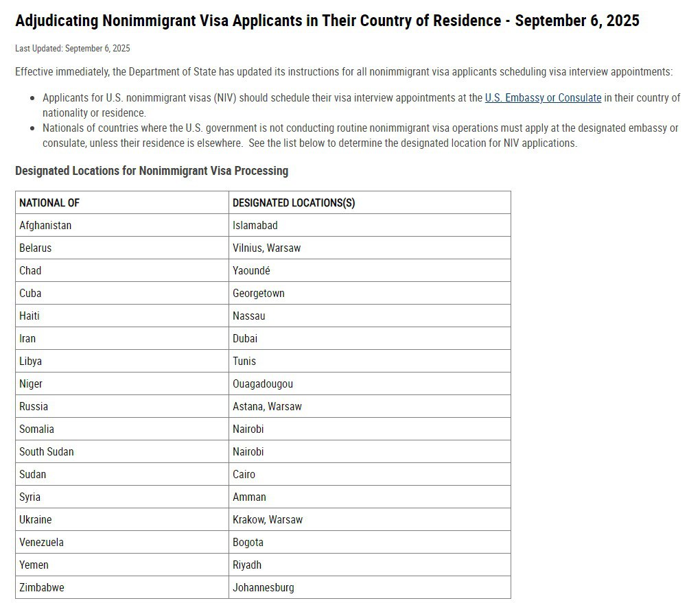 Заявителям на неиммиграционную визу США (NIV) следует записываться на собеседование в посольство или консульство США в стране своего гражданства или проживания. Однако граждане стран, в которых США не проводят плановые операции по выдаче неиммиграционных виз, должны обращаться только в указанные посольства или консульства. К таким относится Украина, гражданам которой придется оформлять визы в Кракове или Варшаве.
