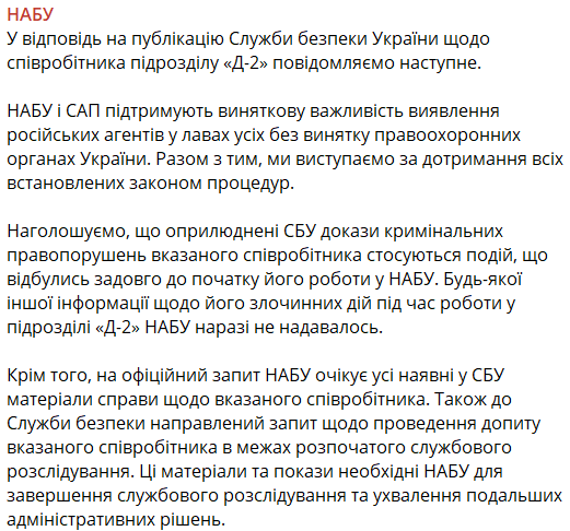 "Обнародованные СБУ доказательства уголовных правонарушений указанного сотрудника касаются событий, которые произошли задолго до начала его работы в НАБУ. Любой другой информации о его преступных действиях во время работы в подразделении "Д-2" НАБУ на данный момент не предоставлялось", - заявляет ведомство.
