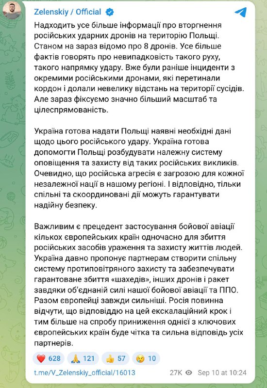 "Все больше фактов говорят о неслучайности такого движения, такого направления удара. Уже были ранее инциденты с отдельными российскими дронами, пересекавшими границу и преодолевающими небольшое расстояние на территории соседей. Но сейчас фиксируем гораздо больший масштаб и целеустремленность. Россия должна почувствовать, что ответом на этот экскалационный шаг и тем более на попытку унижения одной из ключевых европейских стран будет четкий и сильный ответ всех партнеров", - пишет президент Украины.