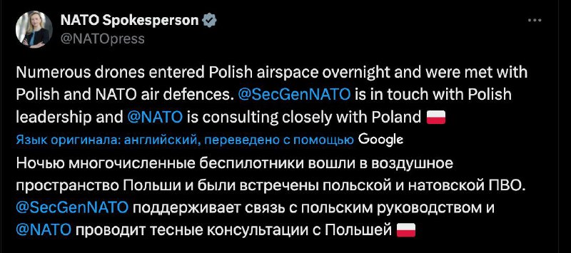 "Ночью многочисленные беспилотники вошли в воздушное пространство Польши и были встречены польской и натовской ПВО. Генеральный секретарь поддерживает связь с польским руководством, НАТО проводит тесные консультации с Польшей", - заявила представительница Альянса.