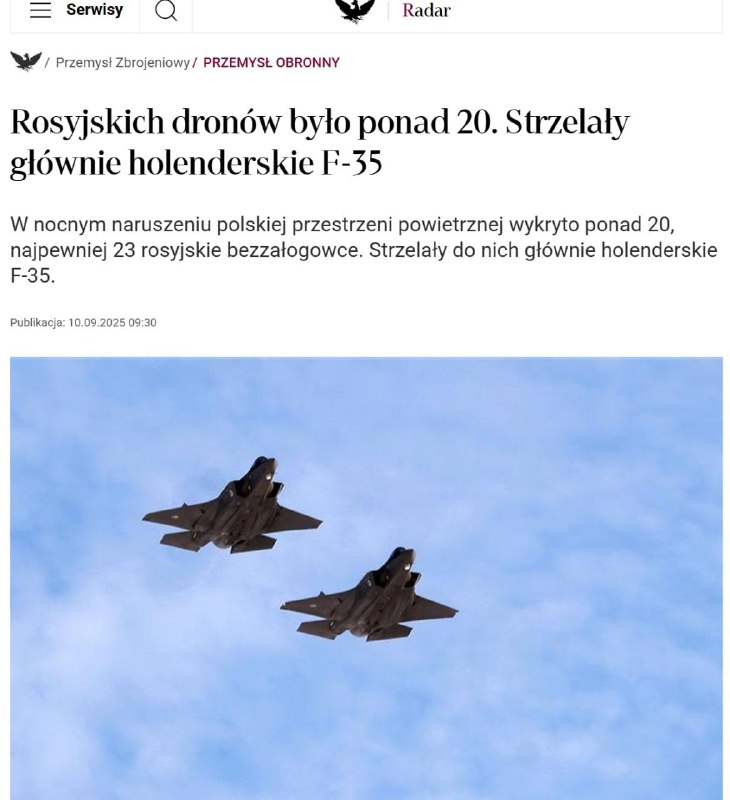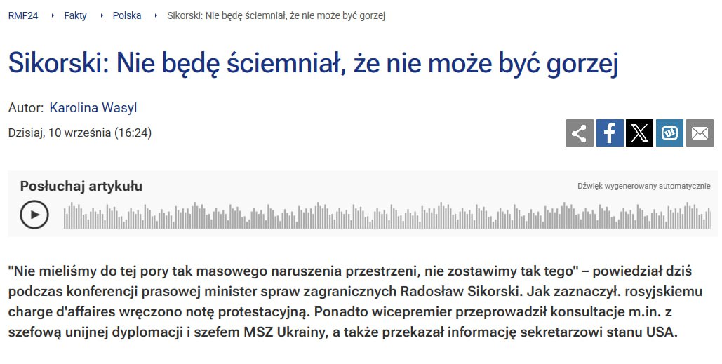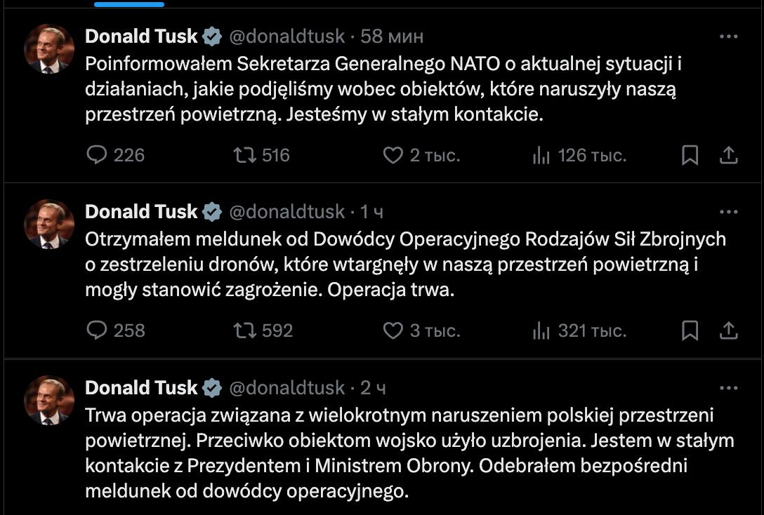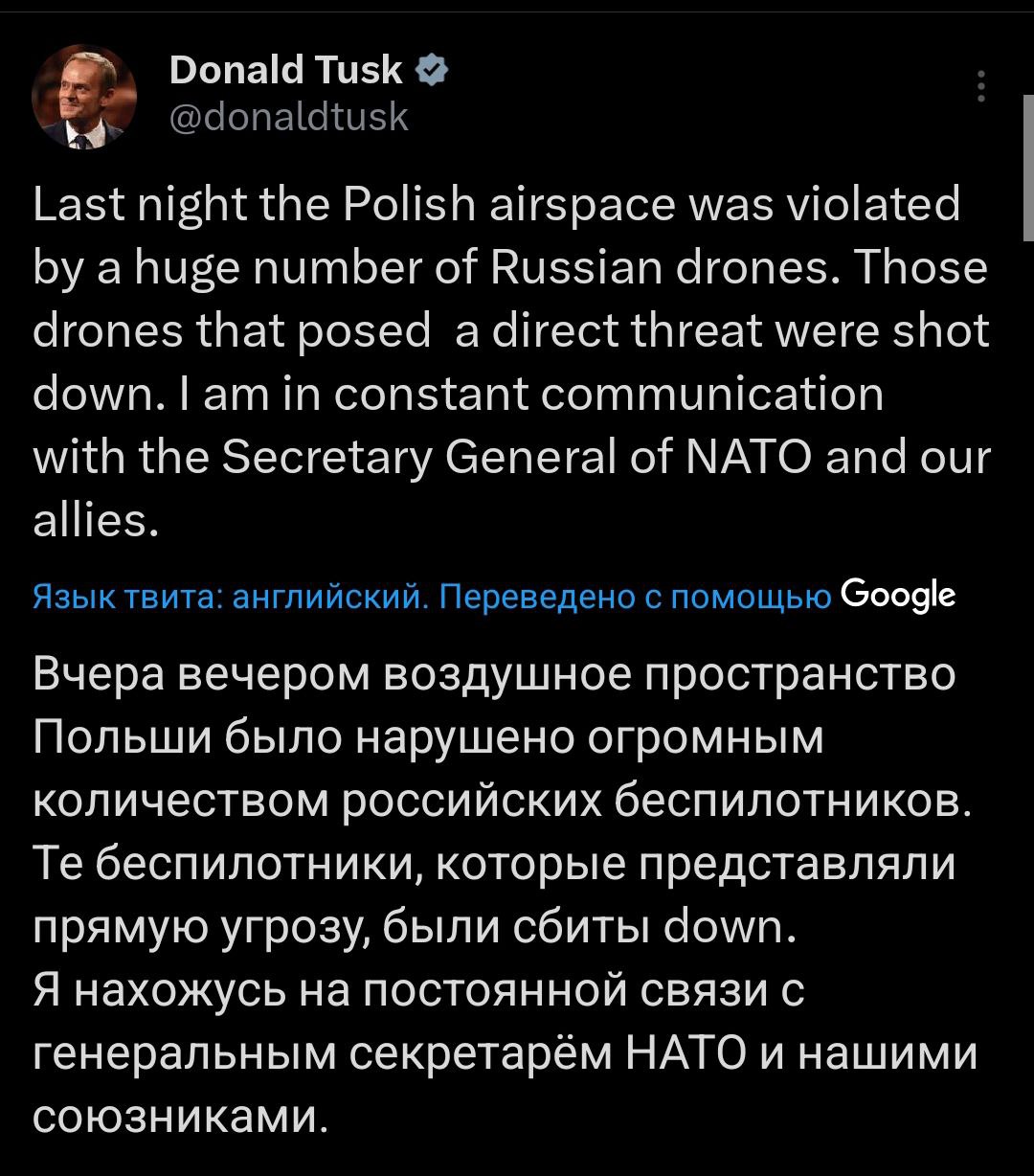9.34 Премьер Польши Туск официально заявил, что дроны, залетевшие на территорию страны, были российскими.