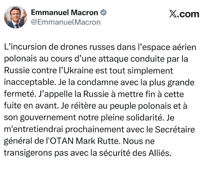 "Вторжение российских дронов в польское воздушное пространство во время атаки России против Украины совершенно неприемлемо. Я самым решительным образом это осуждаю. Призываю Россию прекратить этот безрассудный курс. Я вновь выражаю польскому народу и его правительству нашу полную солидарность. В ближайшее время я проведу беседу с генеральным секретарём НАТО Марком Рютте. Мы не будем идти на компромиссы в вопросах безопасности союзников", - написал президент Франции в Х.