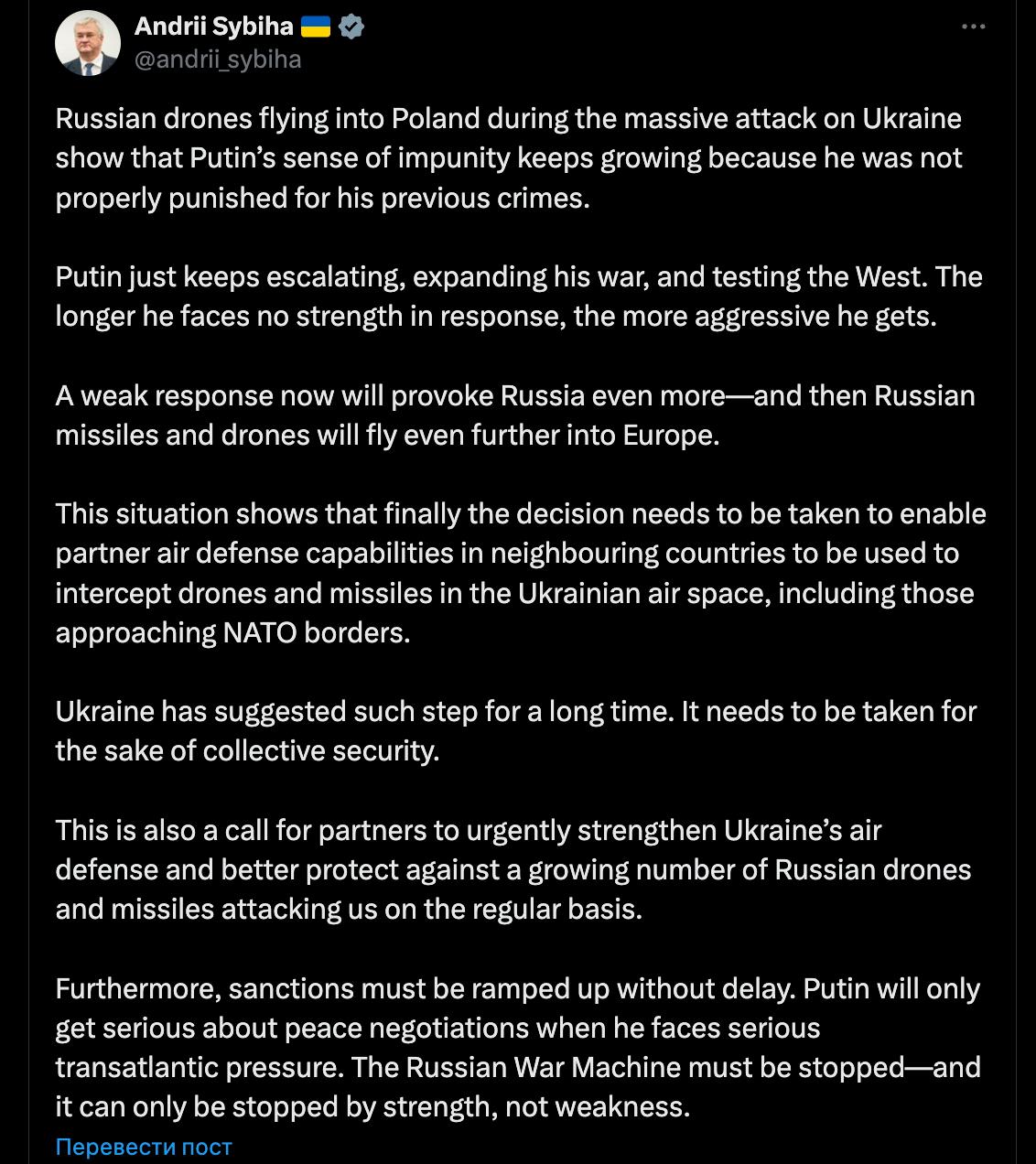 "Слабый ответ сейчас еще больше спровоцирует Россию, и тогда российские ракеты и беспилотники полетят еще дальше в глубь Европы. Эта ситуация показывает, что необходимо, наконец, принять решение о возможности использования возможностей ПВО партнеров в соседних странах для перехвата беспилотников и ракет в воздушном пространстве Украины, в том числе приближающихся к границам НАТО", - написал министр иностранных дел Сибига.