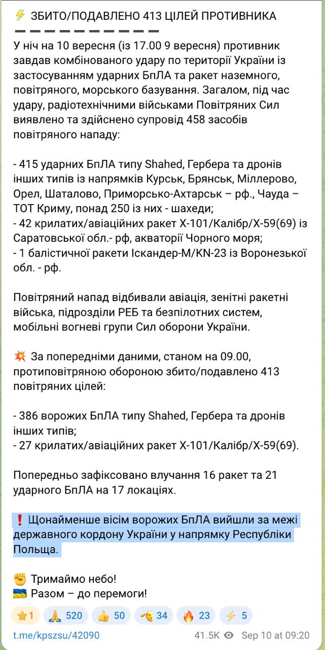 "Во время сегодняшней атаки Российской Федерации, наносящей удары по объектам, находящимся на территории Украины, наше воздушное пространство неоднократно нарушалось объектами типа дрон. Ведётся операция, целью которой является идентификация и нейтрализация этих объектов. По приказу Оперативного командующего ВС Польши было применено вооружение, а службы проводят мероприятия по обнаружению сбитых аппаратов.